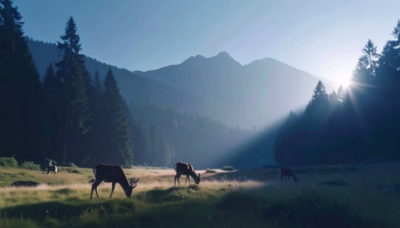 A serene morning in the mountains with deer grazing in a misty meadow as sun rays pierce through the forest. Ai-Generated.