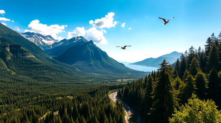 Illustration of a majestic eagle soaring high above snow capped mountains, wings spread wide as it glides effortlessly through the crisp, clear air. The bird strength and freedom symbolize the raw power of nature.