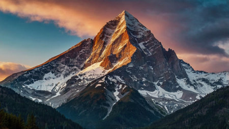 Mountain landscape with snow-capped peaks at sunset in Switzerland
