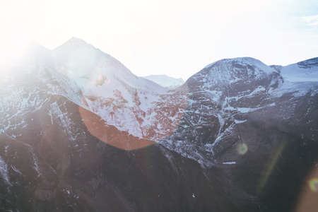 Beautiful sunset view on the high winter mountains peaks, on the sky background. Mountain ice paradise landscape, sunrise light.