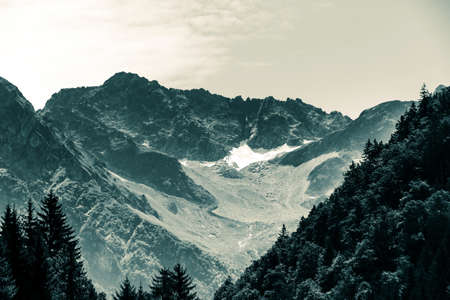 Beautiful colorful sunset over the snowy mountain range and pine tree forest. Nature landscape. Dramatic overcast sky with orange clouds. Main Caucasian ridge, Svaneti, Georgia. Retro toning filter