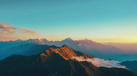 Flat lay of a mountain top view at sunrise, with golden light illuminating the peaks and a deep blue sky stretching above.