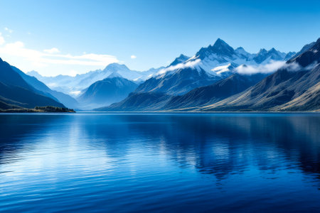 Beautiful blue lake with mountains in the background. The mountains are covered in snow and the lake is calm and still. The scene is peaceful and serene, with the mountains