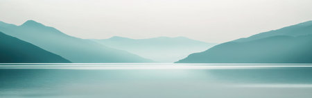 A tranquil landscape displays a smooth gradient transitioning from muted gray to pastel teal over calm waters. Distant mountains fade into the serene scene, creating a peaceful atmosphere.