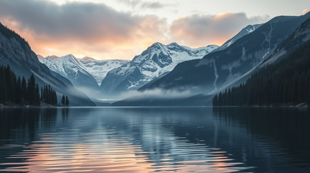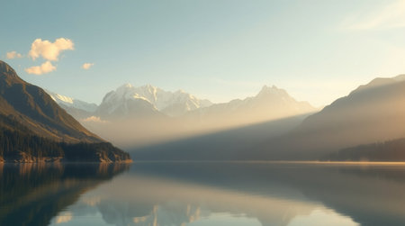 Dawn's gentle light bathes a tranquil lake, revealing pastel hues mirrored on glassy water, encircled by fog-shrouded peaks and subtle shadows.