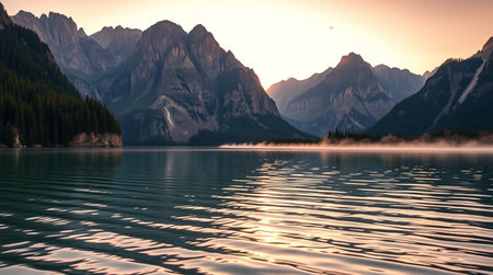 The tranquil lake mirrors surrounding mountains and lush forests, creating a perfect moment of serenity during the early morning hours. Nature invites calmness and reflection.