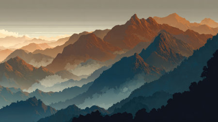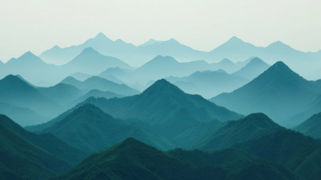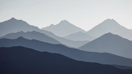 Majestic mountain range with layers of peaks fading into the misty horizon.
