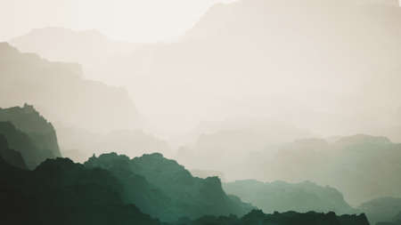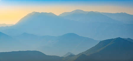 Atmospheric showing misty mountain range layers at sunrise with hazy blue and orange tones keywords:...