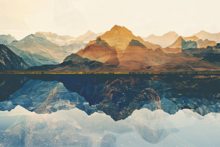 A breathtaking view of majestic mountains with warm hues as the sun sets, perfectly reflected in the calm waters of the lake below, showing nature's beauty.