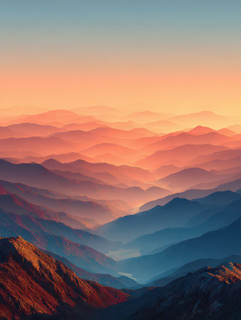 A breathtaking view of mountains layered in soft hues during sunset, showcasing the natural beauty and tranquility of the landscape with a stunning gradient effect.