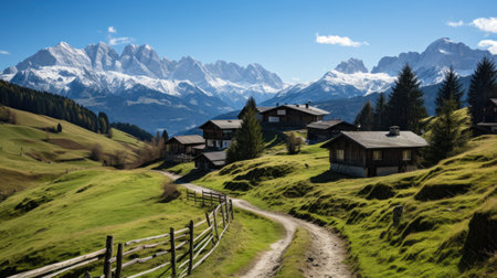 A picturesque alpine village is surrounded by lush greenery and rolling hills, with traditional wooden houses dotting the landscape under a clear blue sky.