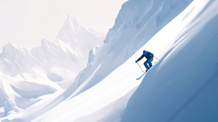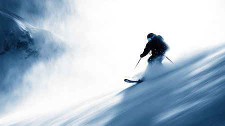 skier gracefully descends snowy slope, surrounded by misty atmosphere, capturing thrill and beauty of winter sports.