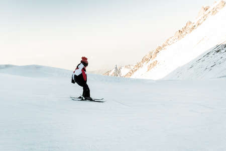 skier skiing on fresh snow on ski slope on Sunny winter day in the ski resort in Georgia