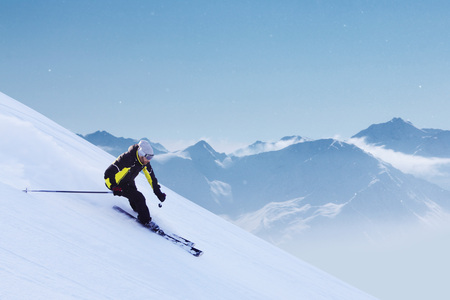 Skier skiing downhill in high mountains. Winter sport and active lifestyle.
