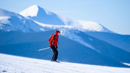 Woman Skier in Red Skiing on the Free Slope in the Beautiful Mountains at Sunny Weather. Skiing and Winter Sports
