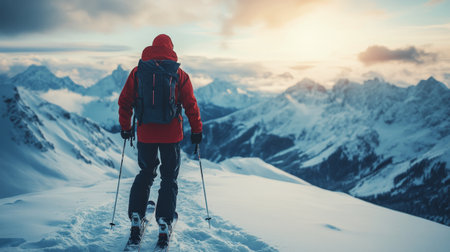 Ski Mountaineering At Sunset, Backcountry Skier In Mountains, Winter Sports Adventure