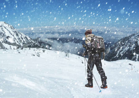 Man trek active sport hiker snow mountaineering winter nature snowboard travel landscape