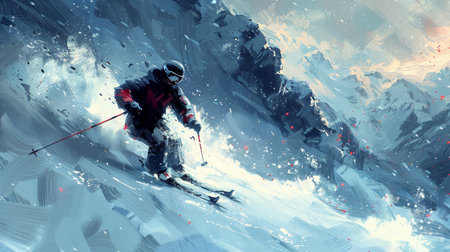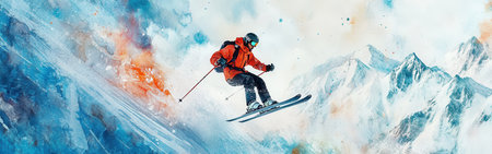 A skilled skier navigates a snowy slope, showcasing agility and speed against a colorful watercolor backdrop. The activity captures the thrill of winter sports in action.