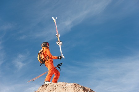 A skier-athlete standing on the edge of a high rock balances his skis in his hands against the blue sky and cirrus clouds