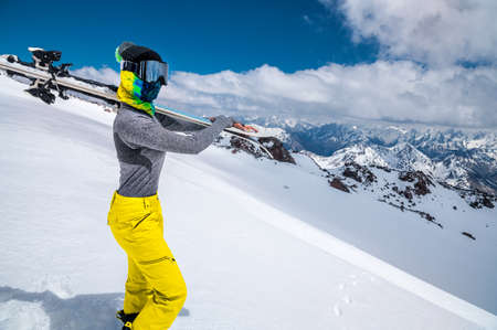Close-up young woman skier in a ski mask with a closed face holds skis on her shoulder against the backdrop of snow-capped mountains