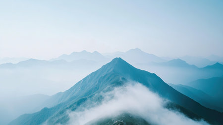 Flat lay of a mountain peak with fog rolling over the valleys, leaving the top half of the image open with clear sky for copy space
