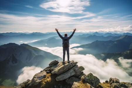 A man is standing on a mountain top, with his arms raised in the air. Concept of freedom and exhilaration, as the man is celebrating his achievement of reaching the summit
