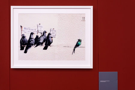 Trieste, Italy - January 21, 2023: Artwork of the series A Great British Spraycation titled Migrants not Welcome by Banksy. The Great Communicator Banksy, Salone degli Incanti, Trieste