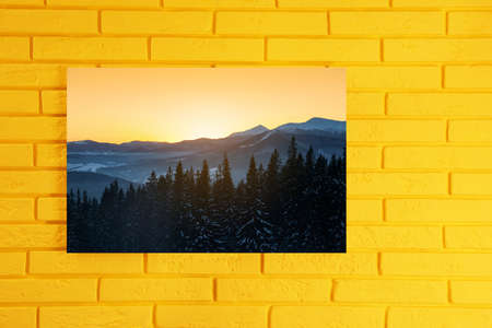 Canvas with printed photo of forest and mountain landscape on yellow brick wall