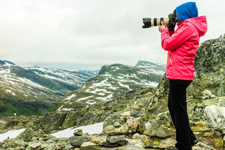 Tourism vacation and travel. Female tourist taking photo with camera, enjoying mountains landscape from Dalsnibba viewpoint, Norway Scandinavia.