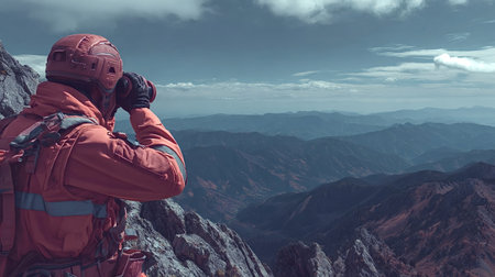 Rescuer wearing gear and helmet standing on a mountain peak, scanning the vast, rugged landscape with binoculars while searching for lost hikers or surveying the terrain