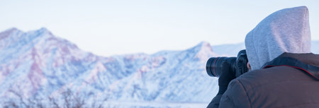 Professional photographer taking picture with modern camera in mountains, space for text. banner design