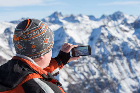 Hiker taking picture with phone to the majestic panoramic view of the italian western Alps in winter season. Cold feeling, selective focus.