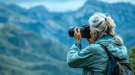 An elderly woman photographing breathtaking mountain scenery, embracing her passion for nature and photography.