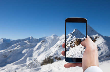 Close-up Of Person Hand Photographing Snowy Mountain Landscape