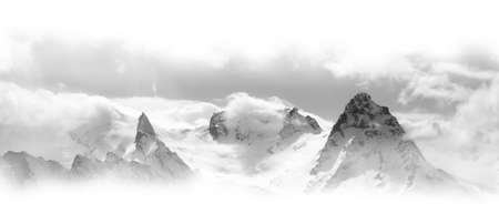 Black and white panorama of high mountains in clouds. Caucasus Mountains, region Dombay at winter. White background for copy space on top and bottom of image.