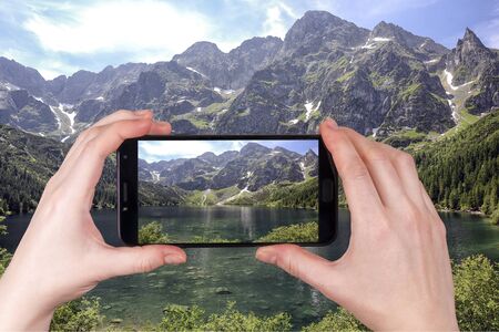 man hands holding mobile phone at Sea and mountains. Tourist on nature makes the photo on the phone