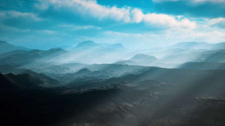 Sun glow in evening misty sky view. Mountain tops silhouettes in clouds. Climate, environment and weather concept sky background.