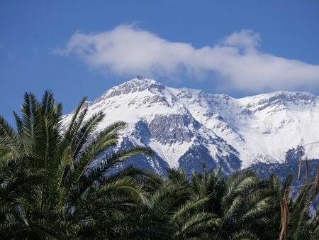 View of snowy peak of Tahtali mountain and green palms in Kemer Antalya Turkey
