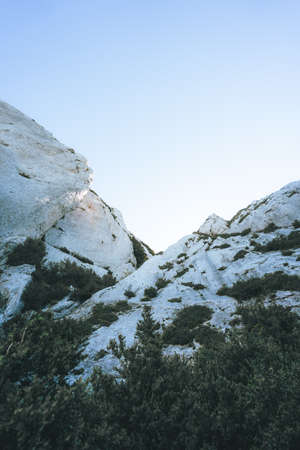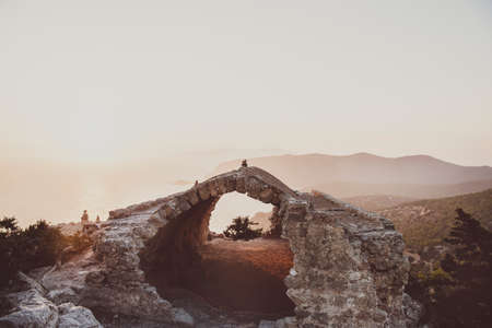 Mountain landscape at sunset. Amazing view from the mountain peak on rocks, low clouds, blue sky and sea in the evening. Colorful nature background. Adventure. Travel in Crimea. Beautiful scenery