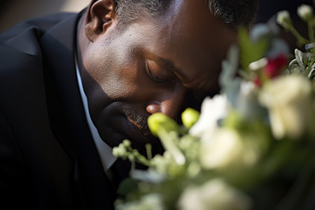 Close-up portrait of a sad African-American man in a suit with a bouquet of flowers