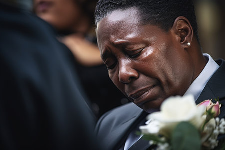 Broken inside African American man dressed in total black cant hold back tears during burial ceremony in church