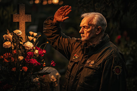 Veteran salutes at a grave in a cemetery near a cross and flowers