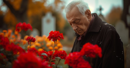 Elderly man in a suit standing in a cemetery with blurred trees and flowers in the background. Themes of reflection, remembrance, and mourning.