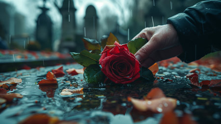 Close-up of a hand putting a red rose on a gray granite headstone. Funeral ceremony, farewell