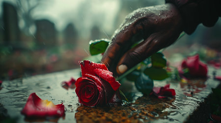 Close-up of a African hand putting a red rose on a gray granite headstone. Funeral ceremony, farewell