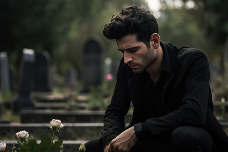 young attractive sad and depressed latin man in black formal suit sitting on grave at cemetery looking sad and depressed suffering depression problem in funeral sorrow concept