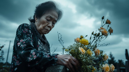 Grieving chnese wife with flowers at her husband funeral. AI generated