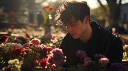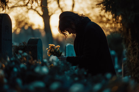 A figure stands in a tranquil cemetery, gently grasping a bouquet of flowers as the sun sets in the background. Shadows dance among the gravestones, evoking a poignant atmosphere of remembrance.