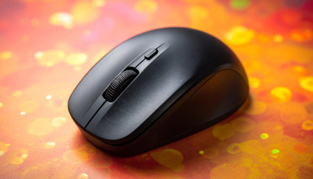 A black wireless computer mouse is shown in close-up against a vibrant, colorful bokeh background with blurred lights.