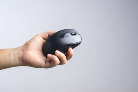 Hand holding black wireless mouse on white background